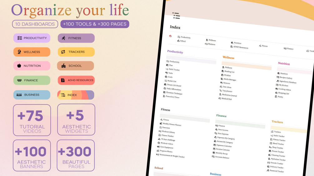 Each part of the template is accompanied by aesthetic banners and specific colours to differentiate the different aspects of your life. This personal notion planner is ideal for all people who want to improve their productivity and their personal life.
