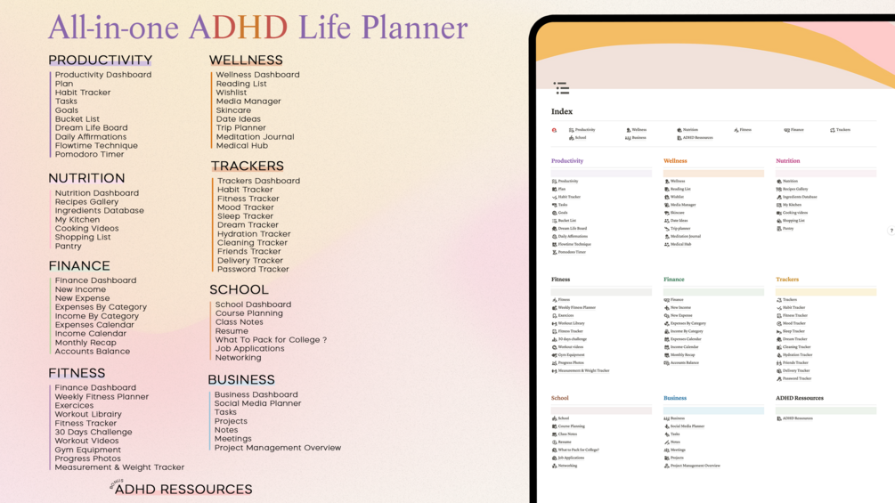 Created for people with ADHD, this template will help you organize your life the way you've always wanted to. The ADHD Life Planner Notion includes +100 pre-built tools & +300 pages. It's the only template you need to organise your life and achieve your goals.