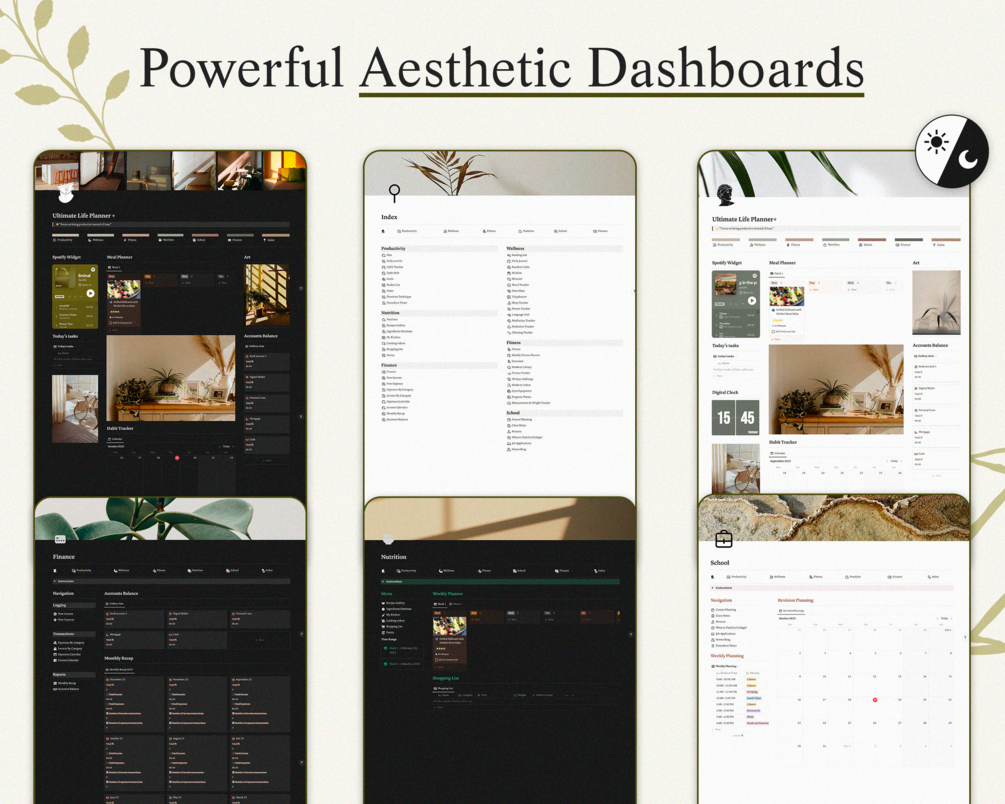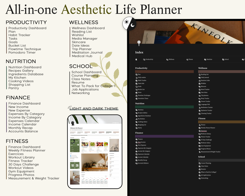- ☀️ Wellness : Reading List, Daily Journal, Random Links, Wishlist, Skincare, Mood Tracker, Date Ideas, Trip Planner, Sleep Tracker, Dream Tracker, Language Hub, Meditation Tracker, Hydration Tracker, Cleaning Tracker.