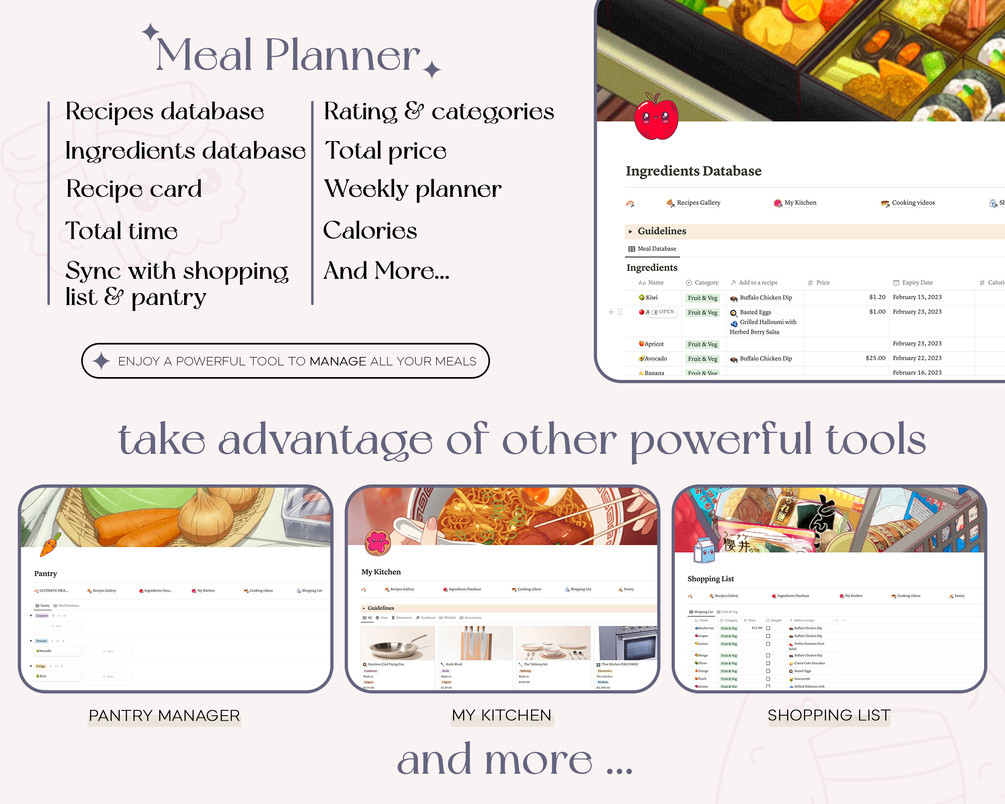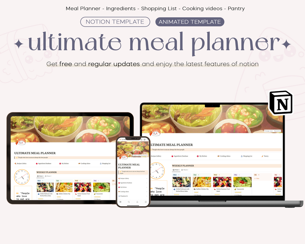 ★★★★★: The template is super well-built and easy to use. I love the functionalities, such as adding to my grocery list and week planning. It saves me so much time every week to plan the meals. And bonus, the anime animations are super cute! Great work!