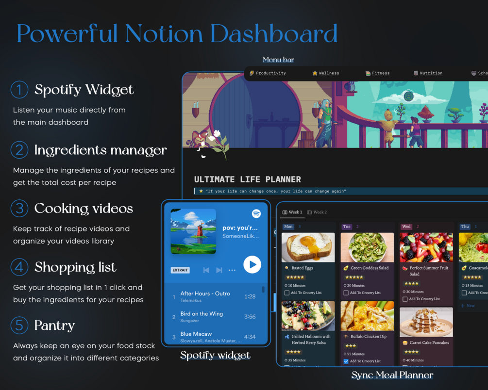 - ☀️ Wellness : Reading List, Daily Journal, Random Links, Wishlist, Skincare, Mood Tracker, Date Ideas, Trip Planner, Sleep Tracker, Dream Tracker, Language Hub, Meditation Tracker, Hydration Tracker, Cleaning Tracker.