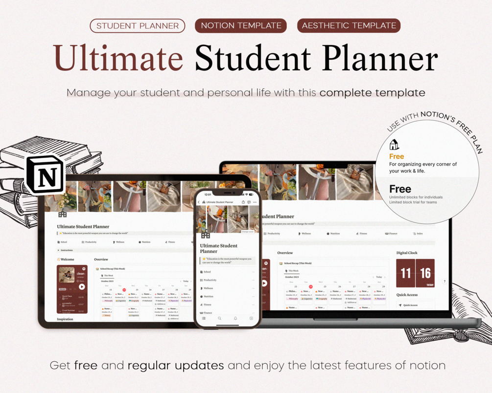 Created for students, this template will help you organize your courses, classes, exams and more !. The Ultimate Student Notion Template includes +75 pre-built tools & +200 pages. It's the only template you need to organise your life and achieve your goals. The template is beginner-friendly and comes with +50 video tutorials. It's very easy to use and takes advantage of Notion's latest features.