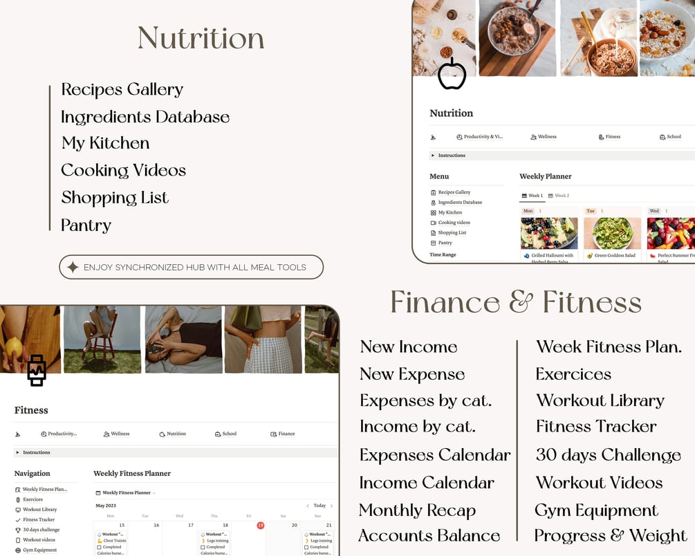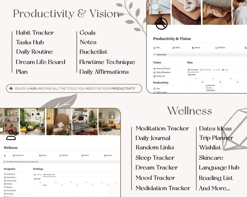 - ☀️ Wellness : Reading List, Daily Journal, Random Links, Wishlist, Skincare, Mood Tracker, Date Ideas, Trip Planner, Sleep Tracker, Dream Tracker, Language Hub, Meditation Tracker, Hydration Tracker, Cleaning Tracker.