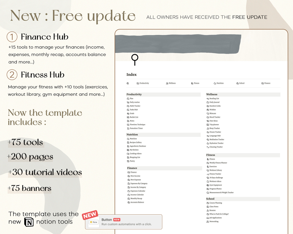 Enjoy new free tools & new features of notion : Spotify widget, meal planner, shopping list, ingredients database, pantry, buttons, cooking videos and more.